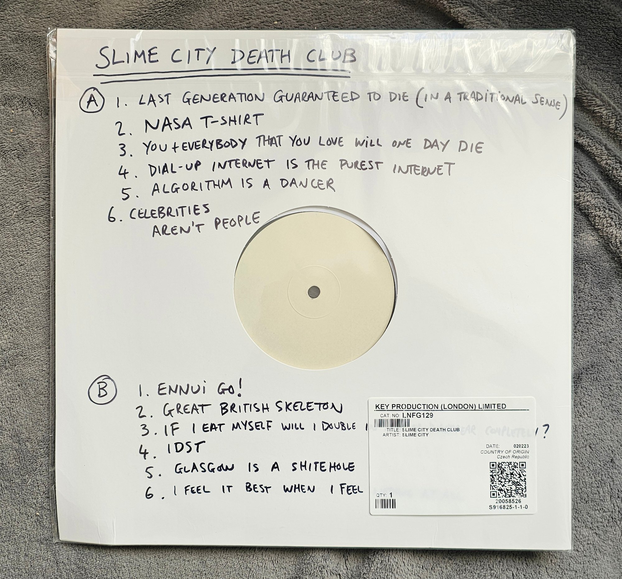 The only remaining 12" vinyl test pressing of the SLIME CITY debut album 'SLIME CITY DEATH CLUB' from 2023. Features hand-written tracklisting.