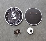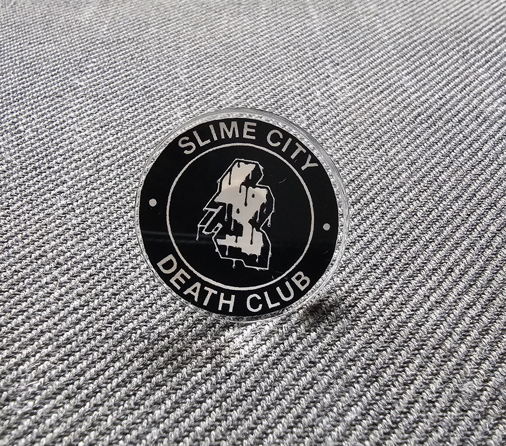 2x Death Club badges - one embroidered with safety pin backing, another plastic with pin backing.