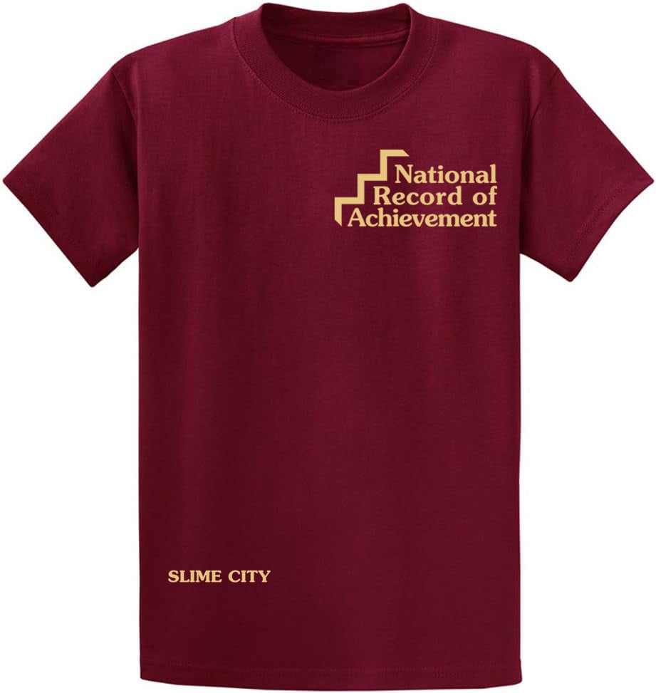Gildan heavyweight burgundy/maroonish t-shirt with NRA logo and SLIME CITY logo in off-yellow. It looks good, okay?