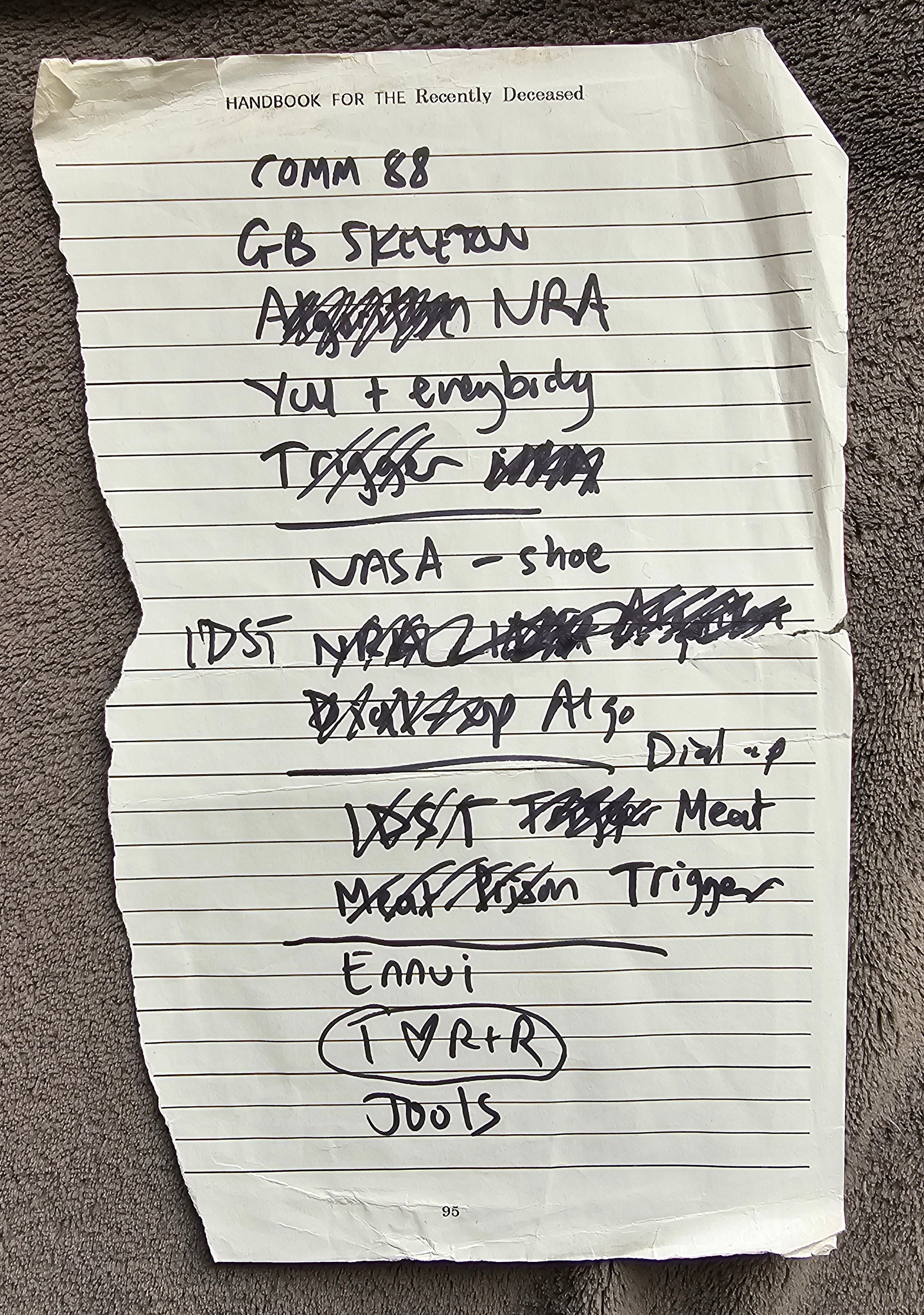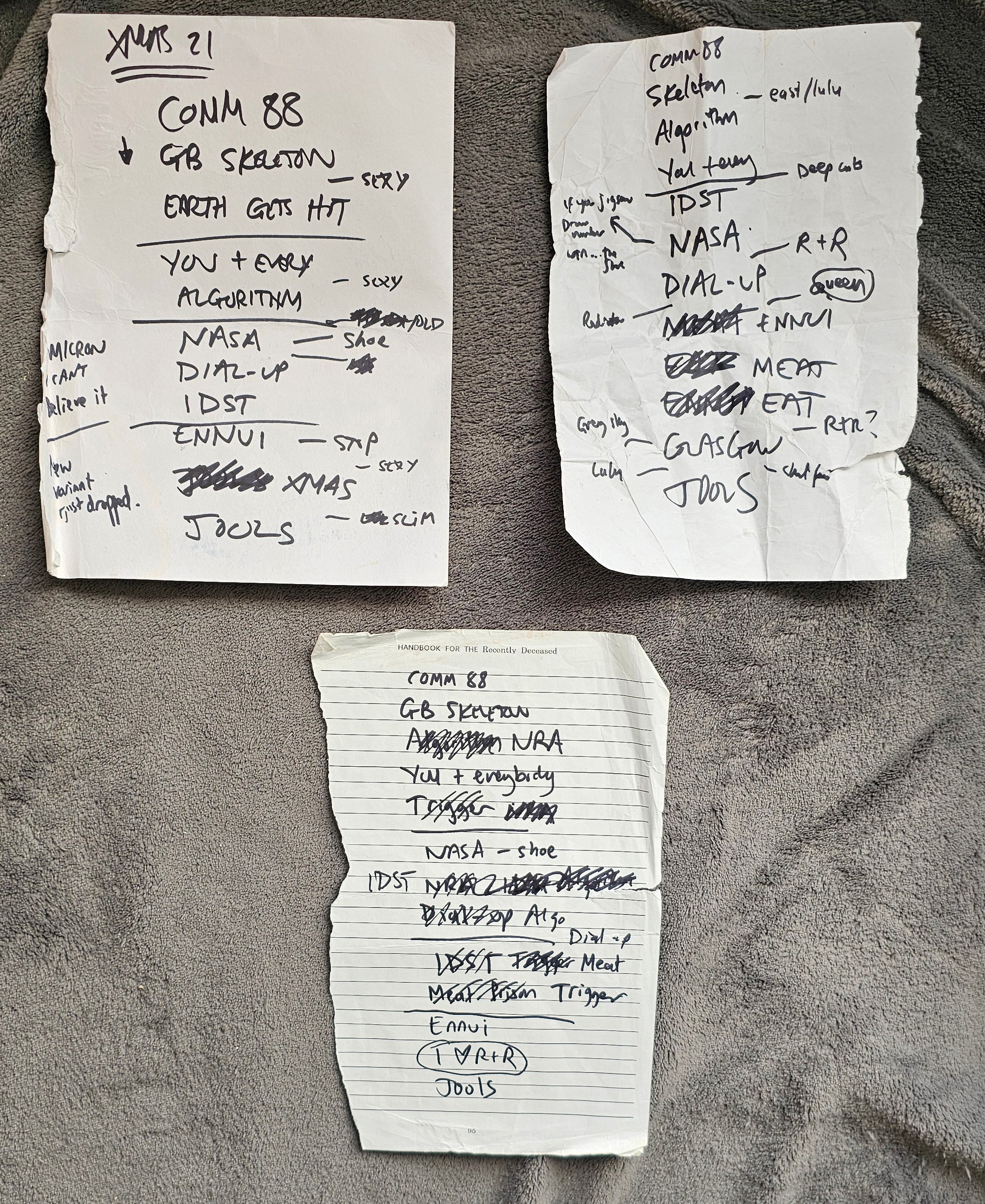 Each set list is unique and hand-written, sometimes changed mid-set, for the gig, with notes and additional scribbles.